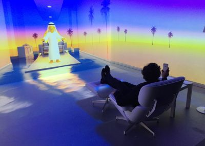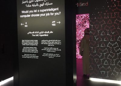The Future Foyer introduced visitors to current technologies that would pave the way to the future scenarios that were presented in the main exhibit. From high frequency algorithmic trading to smart prosthetics to robotic cats, everything was from the current market, but pushing the boundaries of the possible. The Augmentation Spa was a shopping experience for those looking to improve on their natural bodies with the latest scientific advancements from a chip embedded in your ear for instant translation to New Knees which would allow for leaping tall buildings with a single bound to Mood View, an eye implant which would analyze people’s micro-expressions and coach you on how to best handle social situations. The Companion Zone introduced visitors to the in-home AI who would play games with you when you got home, understand your mood and relax you when you were stressed, and nurture and care for your child all with minimal input. The UAE Hive Mind was a benevolent government administration vehicle using human feedback to allow it to guide the decisions of the government to maximize everyone’s happiness.